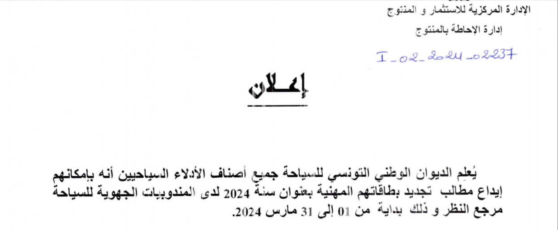 بعلم الديوان الوطني التونسي للسياحة جميع أصناف الأدلاء السياحيين أنه بـإمكانهم إيداع مطالب تجديد بطاقاتهم المهنية بعنوان سنة 2025 لدى المندوبيات الجهوية للسياحة مرجع النظر وذلك بداية من 01 مارس 2025 إلى غاية 30 مارس 2025